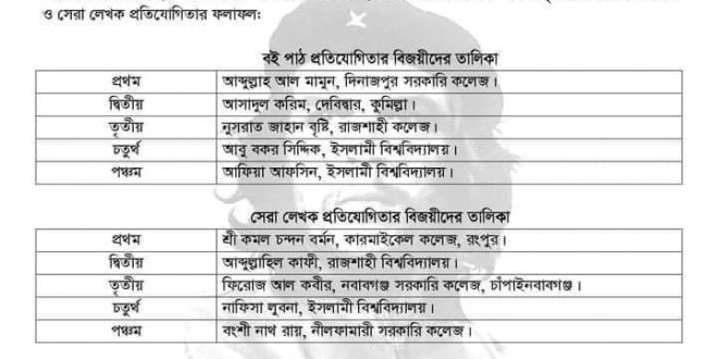 সেরা লেখক প্রতিযোগিতায় প্রথম হয়েছেন কারমাইকেল কলেজের শিক্ষার্থী শ্রী কমল চন্দ্র বর্ম্মন। যথাক্রমে বিজয়ীরা হলেন, আব্দুল্লাহিল কাফি, ফিরোজ আল কবির, নাফিসা লুবনা ও বংশীনাথ রায়। এতে অংশ নেয় ১৫০ জন প্রতিযোগী।