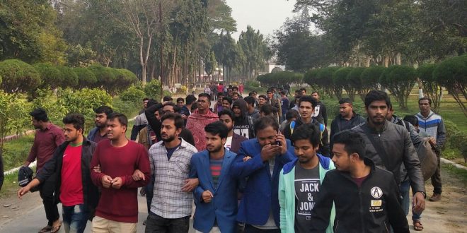 বিক্ষোভে শিক্ষার্থীরা শিক্ষক লাঞ্ছনার বিচার ও বহিরাগত প্রবেশে নিষিদ্ধের দাবি জানায়। এ সময় প্রক্টর অধ্যাপক ড. পরেশ চন্দ্র বর্মন উপস্থিত হয়ে ও যথাযথ পদক্ষেপ নেওয়ার আশ্বাস দেন।