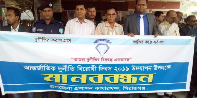 আমরা দুর্নীতির বিরোধে একতাবদ্ধ,এই স্লোগানকে সামনে নিয়ে আন্তর্জাতিক দুর্নীতি বিরোধী দিবস ২০১৯ উদযাপন উপলক্ষে সিরাজগঞ্জের কামারখন্দ উপজেলায় মানববন্ধন ও শিক্ষা প্রতিষ্ঠানের শিক্ষক শিক্ষার্থীরা, উপজেলা প্রশাসনের সদস্যসহ বিভিন্ন শ্রেণীর মানুষ গণস্বাক্ষর করেন।
