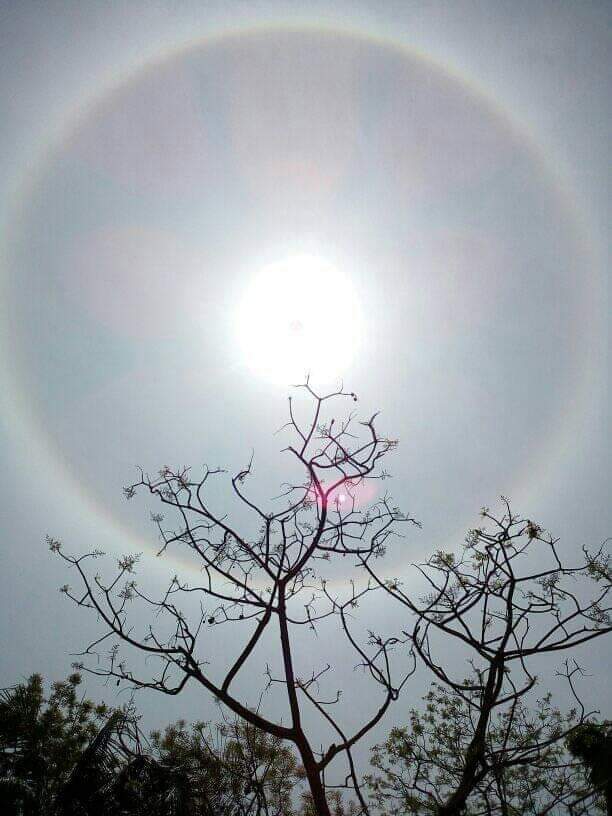 সকাল থেকেই রঙ্গিণ রংধনু সূর্যের চারপাশে ঘিরে রেছেছে। এছাড়া সূর্যকে ঘিরে রেখেছে মেঘাচ্ছন্ন আবরণ। এ যেন সূর্যের নতুন রূপ। নতুন চেহারা। সবাই বলছে- এ কোন রূপ সূর্যের। পৃথিবীতে কি ঘটতে যাচ্ছে ?