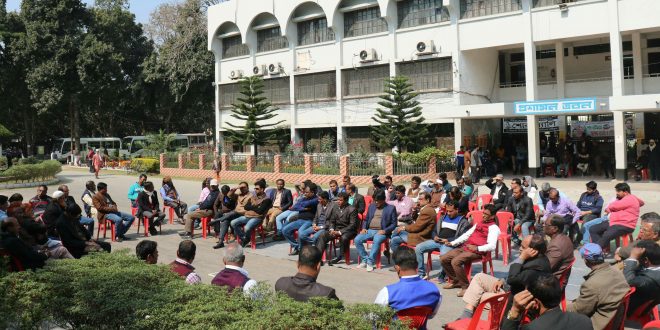 কর্মকর্তা সমিতির সভাপতি মোঃ শামছুল ইসলাম জোহার সভাপতিত্বে ও সাধারণ সম্পাদক মীর মোঃ মোর্শেদুর রহমানের পরিচালনায় এসময় বক্তব্য প্রদান করেন যুগ্ম-সম্পাদক মোঃ রাশিদুজ্জামান খান টুটুল, কোষাধ্যক্ষ মোঃ আব্দুল লতিফ, নির্বাহী সদস্য মোঃ গোলাম হোসেন, আব্দুর রাজ্জাক ও মোঃ উকিল উদ্দিন। অন্যদিকে কর্মকর্তাদের একাংশ অফিসিয়াল কার্যক্রম সচল রেখেছেন বলে জানা যায়।