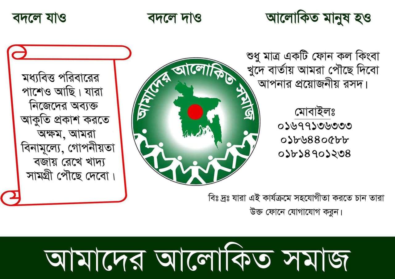 বদলে যাও বদলে দাও আলোকিত মানুষ হও এ স্লোগান ধারন করে করোনা সংকট পরিস্থিতিতে ব্যতিক্রম এক উদ্যোগ হাতে নিয়েছে সেচ্ছাসেবী সামাজিক ও মানবিক সংগঠন আমাদের আলোকিত সমাজ। দেশের বিভিন্ন শহরে বিশেষ করে ঢাকা, চট্টগ্রাম, গাজীপুর কুমিল্লা, নাঙ্গলকোট, সাতক্ষীরা শহরের অসহায় দরিদ্র শ্রমজীবি ও ভাসমান মানুষের ঘরে ঘরে গিয়ে বিনামূল্যে খাদ্যসামগ্রী পৌঁছে দিচ্ছেন আমাদের আলোকিত সমাজ’র প্রতিষ্ঠাতা চেয়ারম্যান এ আর কামরুল ইসলাম, এমদাদুল হক সুজন, এ কে এম মারুফ হোসেন, আফাজ উদ্দিন আসিফ, শরিফুল ইসলাম মিয়াজি, সামছুল ইসলাম মিঠু।