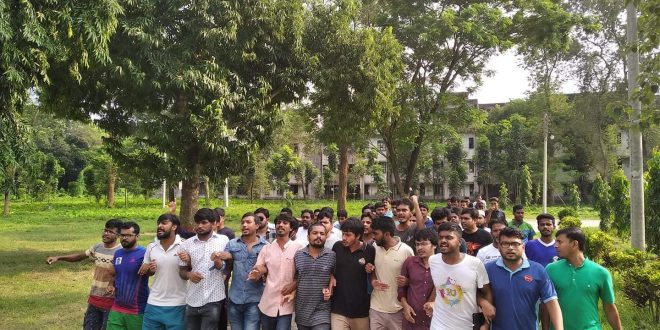 সোমবার দুপুরে জিয়া হল মোড় থেকে মিছিল বের করে শিক্ষার্থীরা। মিছিলটি বিশ্ববিদ্যালয়ের প্রধান ফটকের সামনে সড়ক অবরোধ করে বিভিন্ন স্লোগান দিতে থাকে।