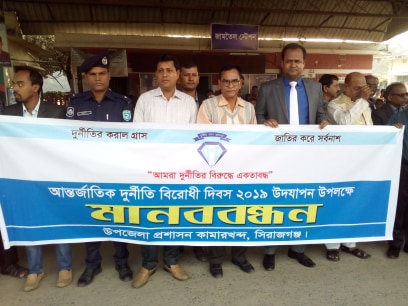 আমরা দুর্নীতির বিরোধে একতাবদ্ধ,এই স্লোগানকে সামনে নিয়ে আন্তর্জাতিক দুর্নীতি বিরোধী দিবস ২০১৯ উদযাপন উপলক্ষে সিরাজগঞ্জের কামারখন্দ উপজেলায় মানববন্ধন ও শিক্ষা প্রতিষ্ঠানের শিক্ষক শিক্ষার্থীরা, উপজেলা প্রশাসনের সদস্যসহ বিভিন্ন শ্রেণীর মানুষ গণস্বাক্ষর করেন।