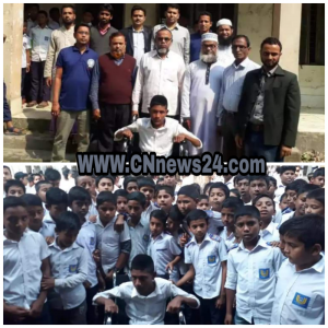 তার অংশ হিসাবে আজ ৬/৩/২০১৯ রোজ বুধবার সকাল ১০ টা সকল ছাত্র শিক্ষকের সামনে শৈশবে পড়ে আসা রামকৃষ্ণপুর কে, কে আর কে উচ্চ বিদ্যালয়ের ৪র্থ শ্রেনির কর্মচারি আলমে’র প্রতিবন্ধী ছেলেকে নবম শ্রেনির ছাত্র সাইফুল ইসলাম’কে একটি হুইল চেয়ার প্রদান করেন।