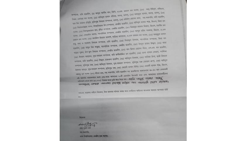 আবেদনে হামলায় অংশগ্রহণকারী হিসেবে যাদের নাম উল্লেখ করা হয়েছে, (১) সঞ্জিত চন্দ্র দাস, সভাপতি, ঢাকা বিশ্ববিদ্যালয় ছাত্রলীগ, (২) সাদ্দাম হোসাইন, সাধারণ সম্পাদক, ঢাকা বিশ্ববিদ্যালয় ছাত্রলীগ, (৩) আমিনুল ইসলাম বুলবুল, সভাপতি, মুক্তিযুদ্ধ মঞ্চ, (৪) আল মামুন, সাধারণ সম্পাদক, মুক্তিযুদ্ধ মঞ্চ, (৫) সনেট মাহমুদ, সভাপতি, মুক্তিযুদ্ধ মঞ্চ, ঢাবি শাখা, (৬) ইয়াসির আরাফাত তুর্য,সাধারণ সম্পাদক, মুক্তিযুদ্ধ মঞ্চ, ঢাবি, (৭) মারিয়াম জাহান খান, ভিপি, সূর্যসেন হল সংসদ, (৮) শেখ মুহাম্মদ তুনান, সাংগঠনিক সম্পাদক, ঢাবি ছাত্রলীগ, (১৯) আব্দুল আলীম খান, ভিপি, এ,এফ, রহমান হল সংসদ, (১০) আবু ইউনুস, এজিএস, বিজয় একাত্তর হল সংসদ, (১১) রাকিবুল হাসান ঐতিহ্য, সদস্য, ডাকসু, (১২) মাহমুদুর হাসান, সদস্য, ডাকসু, (১৩) সাদ বিন কাদের চৌধুরী, মুক্তিযুদ্ধ বিষয়ক সম্পাদক, ডাকসু, (১৪) রবিউল হাসান রানা, সহ-সভাপতি, ঢাবি ছাত্রলীগ, (১৫) নিয়ামত উল্লাহ তপন, শিক্ষা বিষয়ক উপ-সম্পাদক, কেন্দ্রীয় ছাত্রলীগ, (১৬) হাসিবুল হাসান শান্ত, জিএস, জিয়া হল সংসদ, (১৭) সিফাতুজ্জামান খান, ক্রীড়া সম্পাদক, কেন্দ্রীয় ছাত্রলীগ, (১৮) মিজানুর রহমান মিজান, জিএস, মুহসীন হল সংসদ, (১৯) ফেরদৌস আলম, সাংগঠনিক সম্পাদক, কেন্দ্রীয় ছাত্রলীগ, (২০) আব্দুর রহিম সরকার, জিএস, এ.এফ রহমান হল সংসদ, (২১) তানজিল ইমরান তালাশ, সাহিত্য সম্পাদক, এ.এফ রহমান হল সংসদ, (২২) মাহমুদুল হাসান বাবু, তথ্য ও গবেষণা বিষয়ক সম্পাদক, ঢাবি ছাত্রলীগ, (২৩) সিরাজুল ইসলাম, সাংগঠনিক সম্পাদক, জিয়া হল ছাত্রলীগ, (২৪) মামুন বিন সাত্তার, সাংগঠনিক সম্পাদক, কেন্দ্রীয় ছাত্রলীগ, (২৫) ইবনুল হাসান উচ্ছ্বল, (২৬) খাজা খায়ের সুজন, উপ-স্কুল বিষয়ক দিক, কেন্দ্রীয় ছাত্রলীগ, (২৭) খান মিলন হোসেন নীরব,এস.এম. হল ছাত্রলীগ, (২৮) ইমরান আহমেদ, যুগ্ম-সাধারণ সম্পাদক, কবি জসীম উদ্দিন হল ছাত্রলীগ, (২৯) হৃদয় হাসান সোহাগ, গণশিক্ষা সম্পাদক, ঢাবি ছাত্রলীগ, (৩০) উজ্জল, চারুকলা ছাত্রলীগ, (৩১) আরিফুল ইসলাম, (৩২) ফাতিমা রিপা, ছাত্রী বিষয়ক সম্পাদক, মুক্তিযুদ্ধ মঞ্চ, (৩৩) আমিনুল ইসলাম, যুগ্ম-সাধারণ সম্পাদক, মুক্তিযুদ্ধ মঞ্চ (জামাল গ্রুপ), (৩৪) আইনুল ইসলাম মাহবুব, যুগ-সাধারণ সম্পাদক, মুক্তিযুদ্ধ মঞ্চ, (৩৫) মেহেদী হাসান নিবিড় (৩৬) মেহেদী হাসান শান্ত, জিএস, বঙ্গবন্ধু হল সংসদ (৩৭) জীবন রায়, সহ সভাপতি, ঢাবি ছাত্রলীগসহ ছাত্রলীগের অজ্ঞাতনামা ৪০-৫০ জন নেতাকর্মী হামলায় প্রত্যক্ষভাবে অংশ নেয়।